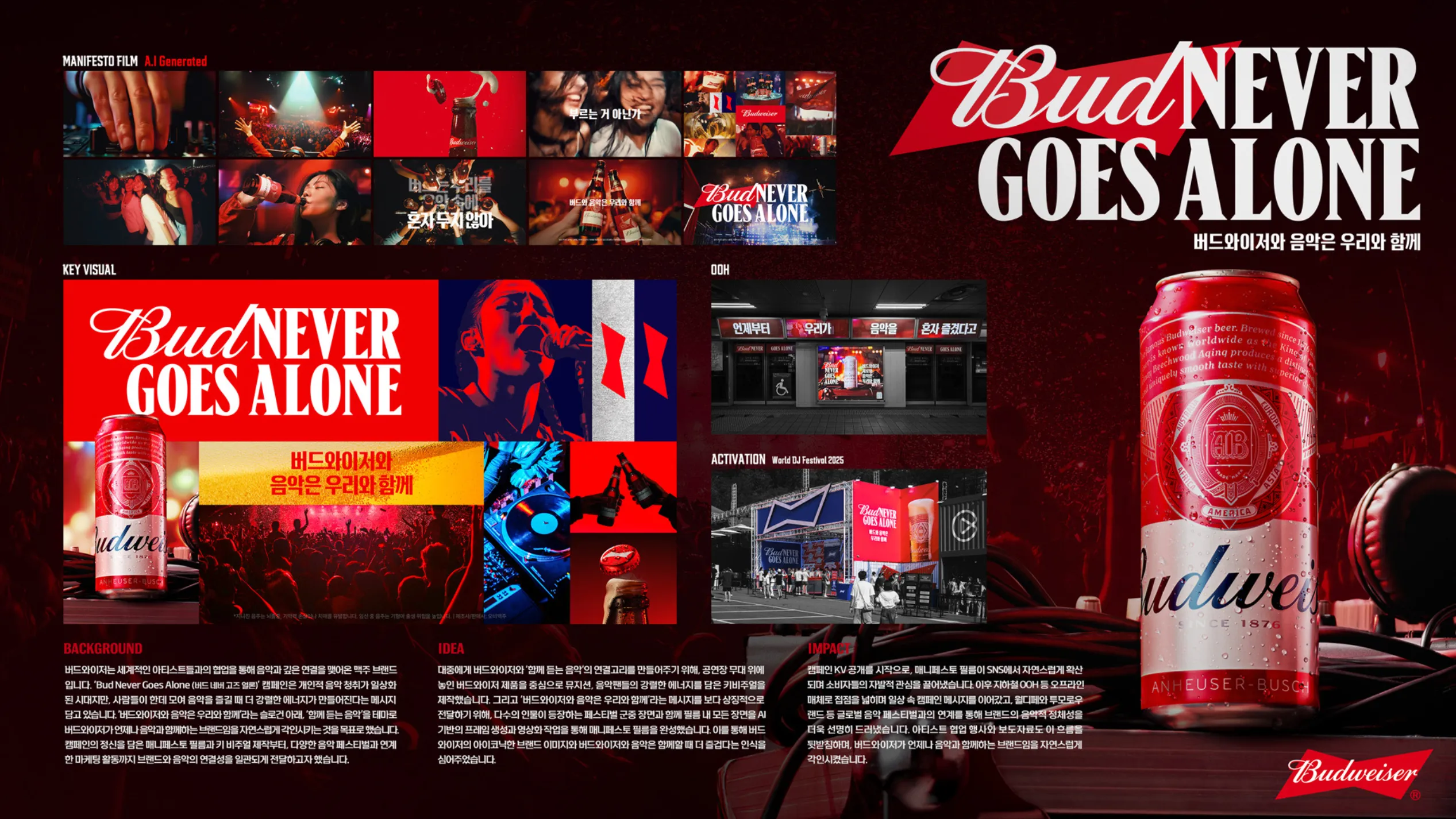 A. 버드와이저의 핵심은 음악, 파티, 그리고 ‘함께함’입니다. “Bud never goes alone” 라는 슬로건처럼 수많은 군중이 어우러지는 에너지를 보여줘야 했습니다.